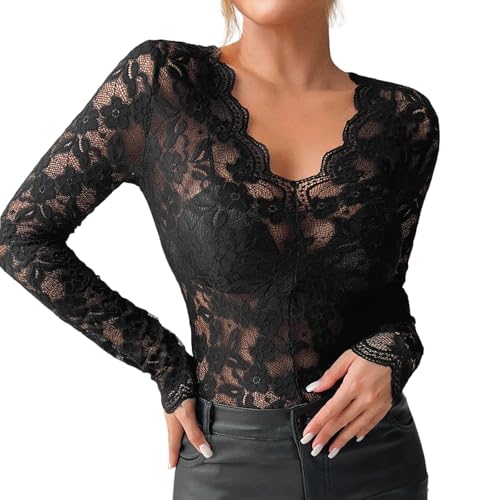 Bastwahl Haut en Dentelle Noir Femme en Maille à Manches Longues Sexy Élégant Transparent Chic Haut Chemisier Léger Florale Col V Y2k à Col Rond Tenue Rave Pull Soirée Cocktail Travail