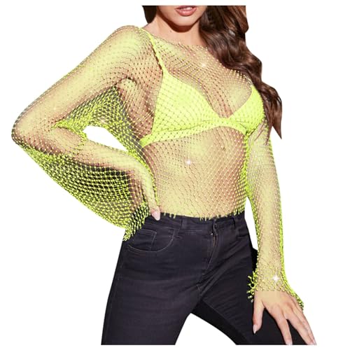 Haut en maille pour femme - Élégant - Transparent - En maille - Tenue rave - Haut à paillettes - Haut en dentelle - Noir - Élégant - Manches longues