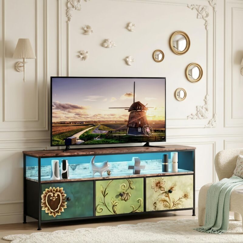 Tanant - Meuble tv 137 cm - avec 3 tiroirs, Meuble tv acve éclairage led, Structure en Fer, Pieds réglables en Hauteur, Meuble tv Motif vintage