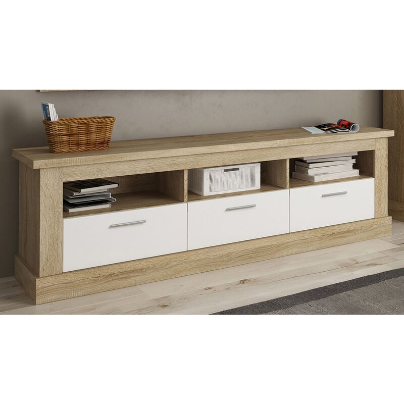 Pegane - Meuble tv avec 3 tiroirs coloris Chêne vieilli - Longueur 180 x Profondeur 41 x Hauteur 56 cm