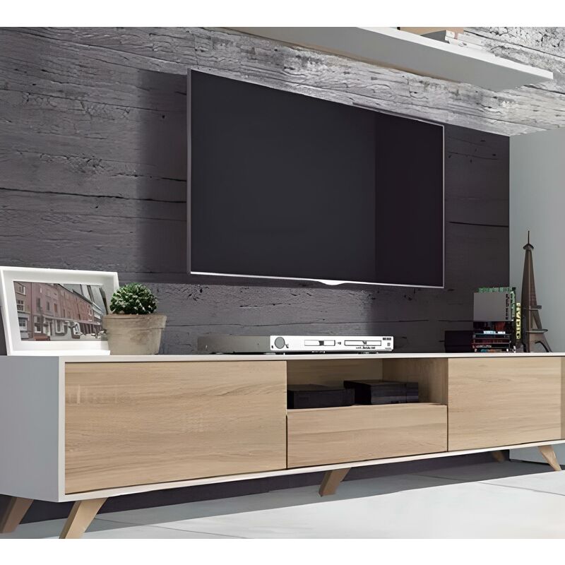 Pegane - Meuble tv avec pieds coloris Blanc / Chêne Cambrian - Longueur 183 x profondeur 35 x hauteur 44 cm
