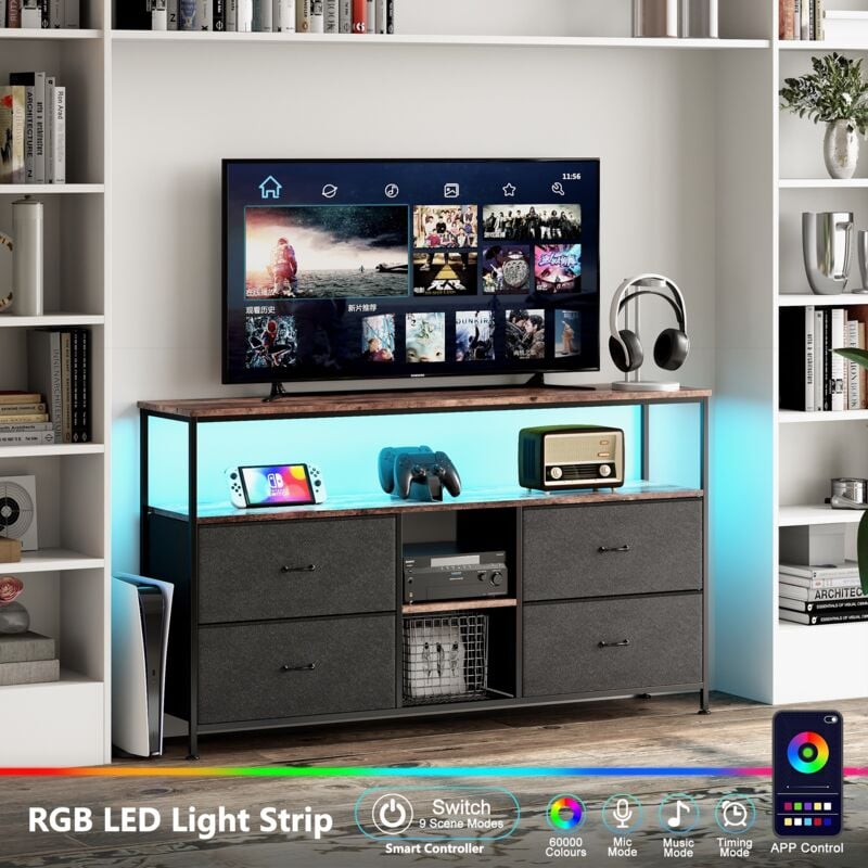 Tanant - Meuble tv 137 cm - avec 4 tiroirs en tissu noir, éclairage led, structure en fer, pieds réglables en hauteur, Meuble tv moderne - Marron