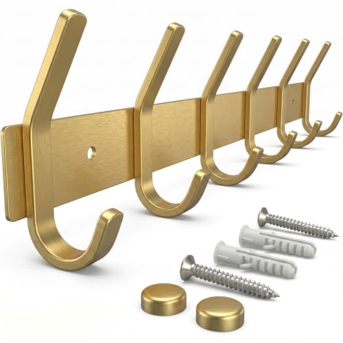 SAYONEYES Porte-manteau mural doré brossé avec 6 crochets doubles pour suspendre – 43,2 cm – Crochets muraux rustiques en acier inoxydable SUS304 – Chapeau, vêtements, sac à main, serviette – 1 paquet