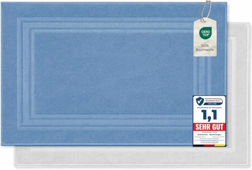 Komfortec Lot de 2 Tapis de Bain en Tissu éponge Lavable, 600 g/m² et 100% Coton, Absorbant et séchage Rapide, 50 x 70 cm, Bleu Clair/Blanc