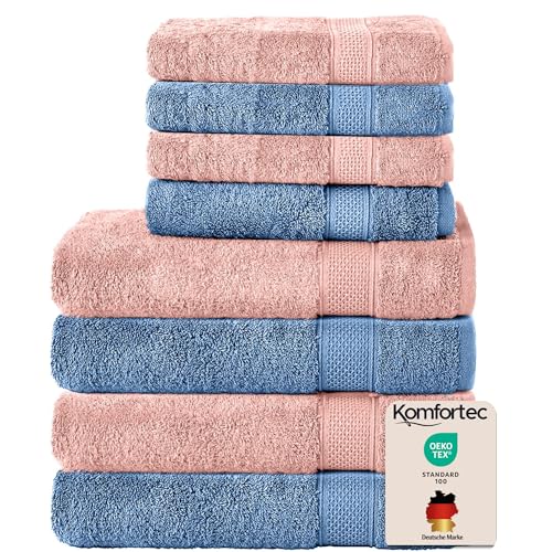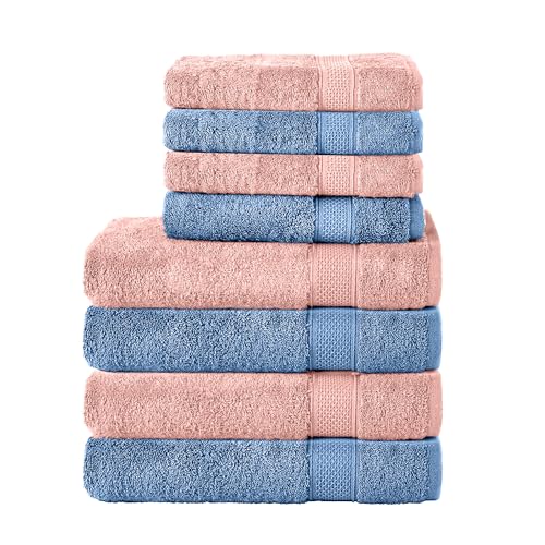 Komfortec Lot de 8 Serviettes 100% Coton, 4 Serviettes de Bain de 70 x 140 cm et 4 Serviettes de Toilette de 50 x 100 cm, éponge Douce, Grande Taille, Rose/Bleu Clair