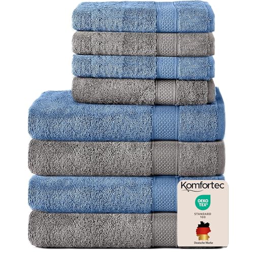 Komfortec Lot de 8 Serviettes 100% Coton, 4 Serviettes de Bain de 70 x 140 cm et 4 Serviettes de Toilette de 50 x 100 cm, éponge Douce, Grande Taille, Anthracite/Bleu Clair