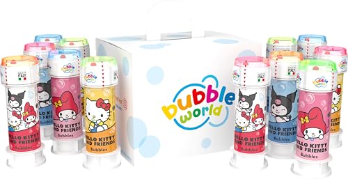 Bubble World - Lot de 12 Bulles de Savon Hello Kitty & Friends pour Enfants - Party Pack de 60 ML - Gadgets d'anniversaire sur Le thème des Personnages - Fabriqué en Italie