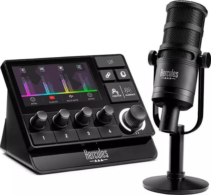 Hercules Stream Starter Kit - Stream 100, Contrôleur audio gaming pour PC Windows + micro HUD-600 USB/XLR + Voicemod Pro (3 mois)