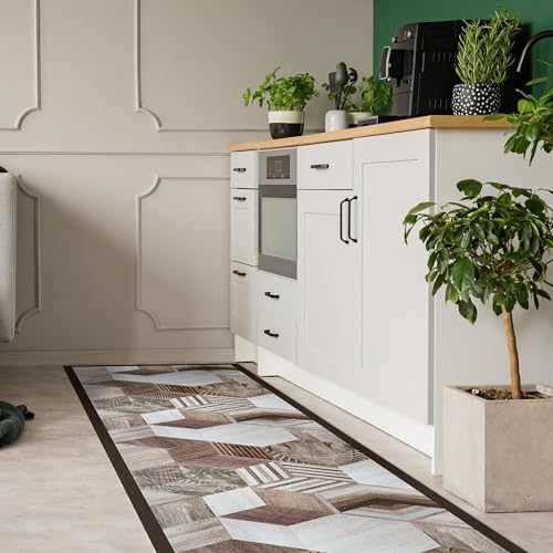 CREARREDA Wood Tropical Hexagons Kitchen Rug, 180 x 50 cm, Non-Slip and Washable Vinyl, 100% Made in Italy, Deluxe Line