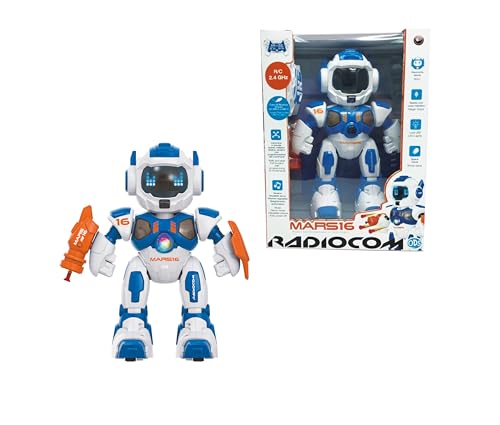Radiocom - Mars 16 - Robot RC 2,4 GHz pour Enfants - Marche, Tourne, Translation - Tirer des fléchettes - Raconter des Histoires - Bras oscillant - Voix et Musique - Lumières - Programmable - Mode