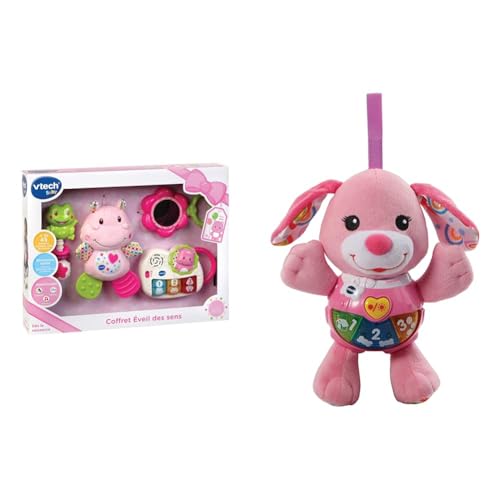VTech - Coffret Naissance Éveil des Sens Rose, Premiers Jouets Bébé, Doudou Hippo en Peluche & Chant' Toutou Rose, Peluche Chien Interactive, Hochet Bébé, Éveil Musical, Jouet Poussette