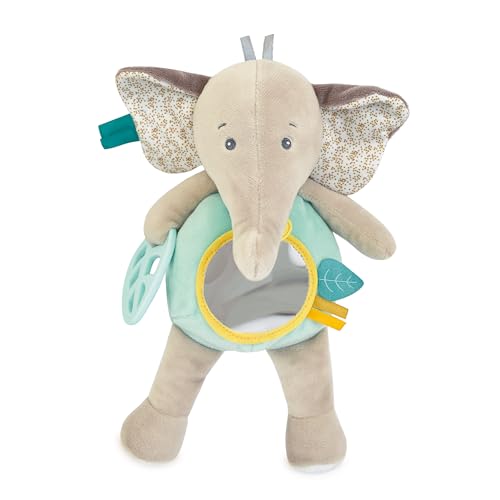BABY NAT' - Pantin Activités Bébé Éléphant 25cm Cacahuète - Doudou Éléphant Bébé - Jouet Éveil Bébé Hochet, Miroir, Anneau Dentition - Jouet Sensoriel Bébé - Cadeau Naissance - BN6035