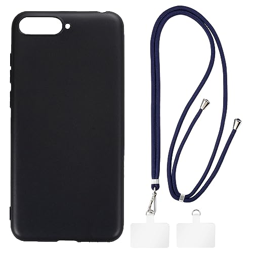 Shantime Coque et Lanière Bandoulière Compatible avec Huawei Honor 7A Pro Coque de Téléphone et Sangle de Cou Réglable avec Boucles Métalliques et 2 Patchs(Noir + Bleu)