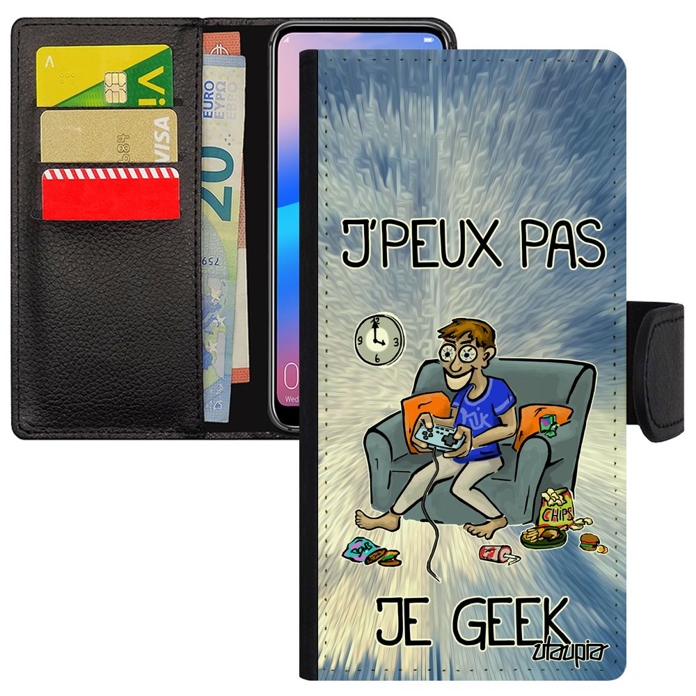Coque pour Honor 7A simili cuir rabat porte cartes j'peux pas je geek de protection jeux video bleu bumper comique noir drole texte