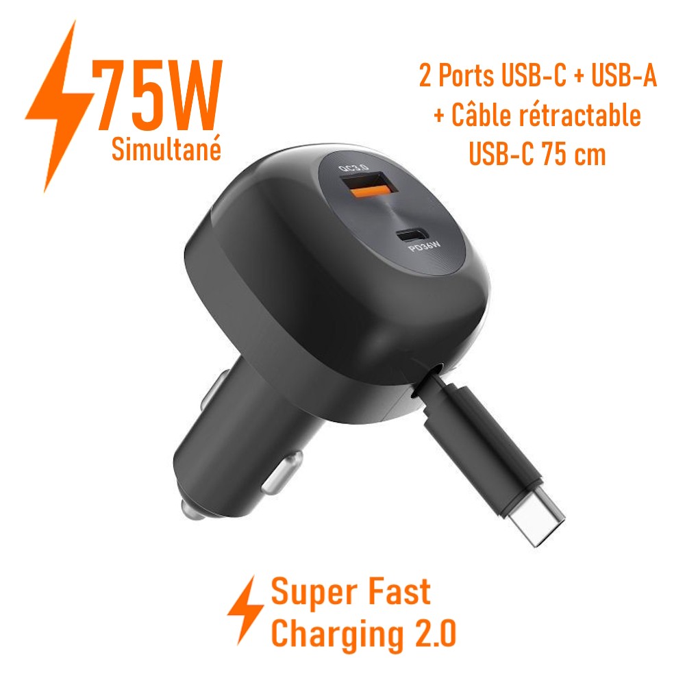 Chargeur Voiture Retractable 75W pour Honor X6b X7 X6 3 Ports Charge Rapide