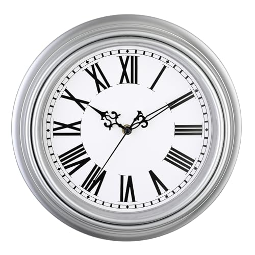 Plumeet Horloge Murale Vintage, Horloge Silencieux Classique de 30cm pour Salon, Chambre de Coucher ou Bureau, Horloge Murale à Chiffres Romains, Alimenté par Piles, Argenté