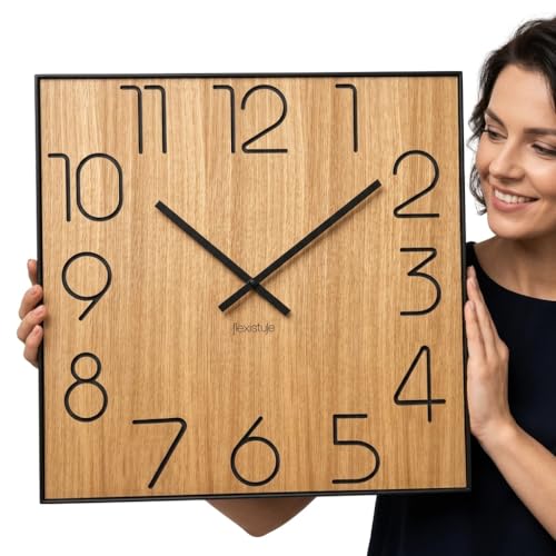 FLEXISTYLE Digits Eco Grande Horloge Murale en Bois, Aspect Bois, carrée, silencieuse, pour Salon, Chambre à Coucher, fabriquée en UE (Noir, 60 cm)