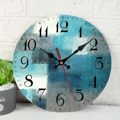 ArtSocket Horloge murale en bois turquoise silencieuse sans tic-tac, vert, bleu, gris, bleu sarcelle, peinture abstraite grise, horloge murale ronde décorative pour la maison, la cuisine, le salon, le