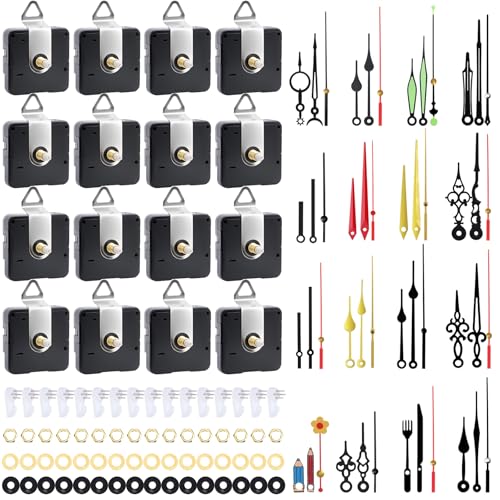 QLOUNI Lot de 16 Mecanisme Horloge Murale, Mécanisme Horloge à Pile avec 16 Paires Différentes Horloge Aiguilles- Mouvement à Quartz Silencieux pour Réparation d'horlogerie DIY, Rechange