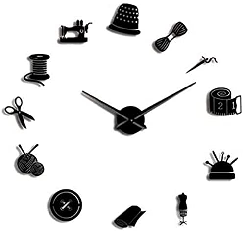 Horloge Murale Tailleur Boutique décorative Bricolage Grande Horloge Murale pour Salon Vintage Machines à Coudre Outils Miroir Horloge géante Autocollant Mural 47 Pouces Noir