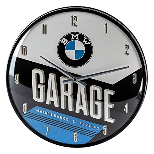 Nostalgic-Art Horloge rétro, Ø 31 cm, BMW – Garage – Idée Cadeau pour Fans de BMW, Official License Product (OLP), décoration Murale Cuisine, Design Vintage, Multicouleur