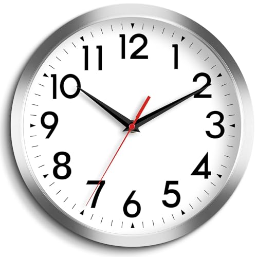 DAXSMY Horloge Murale Moderne à Piles, 25,4 cm, Simple et silencieuse, sans tic-tac, décoration pour Cuisine, Bureau, extérieur, Chambre, Salon, école, Salle de Classe (Argent)