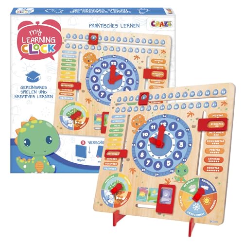 CRAZE My Learning Clock Dino Langue Anglaise - Horloge éducative pour Enfants en Bois, Calendrier pour Apprendre aux Enfants, Tableau d'apprentissage Saisons