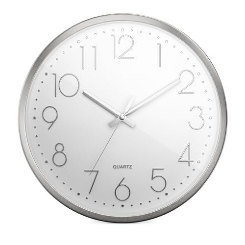 Mebus Horloge Murale à Quartz, Mouvement Silencieux sans Bruit de tic-tac, Mouvement à Quartz précis, Cadre en Aluminium, Chiffres Arabes en 3D, Aiguilles en Aluminium, boîtier argenté, Cadran :