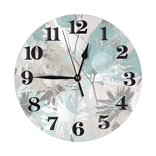 Horloge murale ronde à imprimé feuilles grises menthe numérique, horloges murales rondes pour décor de salon, horloge murale décorative silencieuse sans tic-tac pour cuisine à domicile (9,84 pouces)