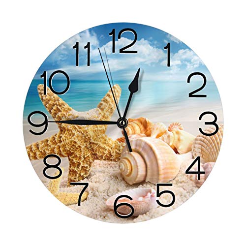 Hdadwy Étoiles de mer et Coquillages 3D élégants sur la Plage avec Horloge Murale Ronde Ciel Bleu Vif à Piles Quartz analogique Silencieux décoration de Cuisine horloges murales (9,5 Pouces)