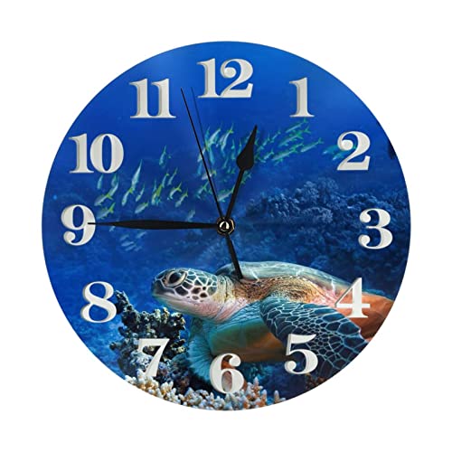 Tortue de mer avec poissons imprimés horloge murale ronde numérique, horloges murales rondes pour décor de salon, horloge murale décorative silencieuse sans tic-tac pour cuisine à domicile (9,84 pouce