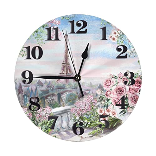Belle Tour Paris Imprimer Horloge Murale Ronde Numérique, Horloges Murales Rondes pour Décor de Salon, Silencieux Non Coutil à Piles pour Horloge Décorative Murale de Cuisine à la Maison (9,84 Pouces)