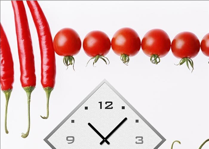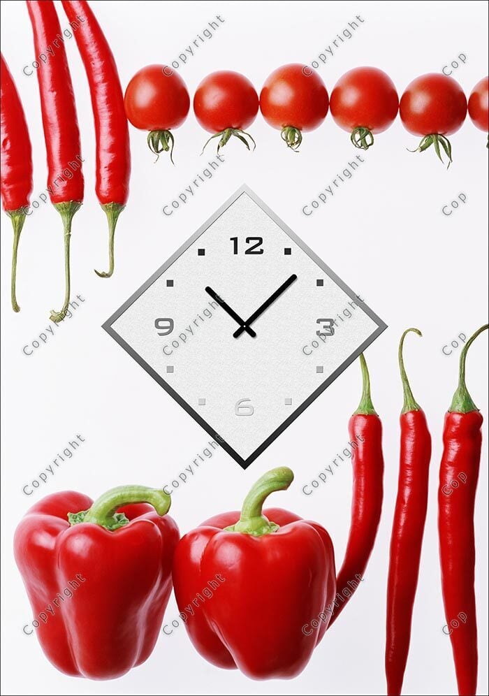 4182 Dixtime Horloge murale design, horloges murales, horloge de cuisine stylée, rouge blanc, poivron tomate pepperoni 50cm x 70cm