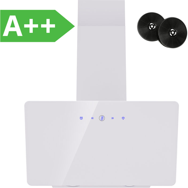 Wiggo Hotte aspirante 60 cm sans tête I évacuation d'air recirculation 300 m³/h – Écran tactile LED 3 niveaux I inclinée avec filtre à graisse & 2 filtres à charbon I avec façade en verre blanc