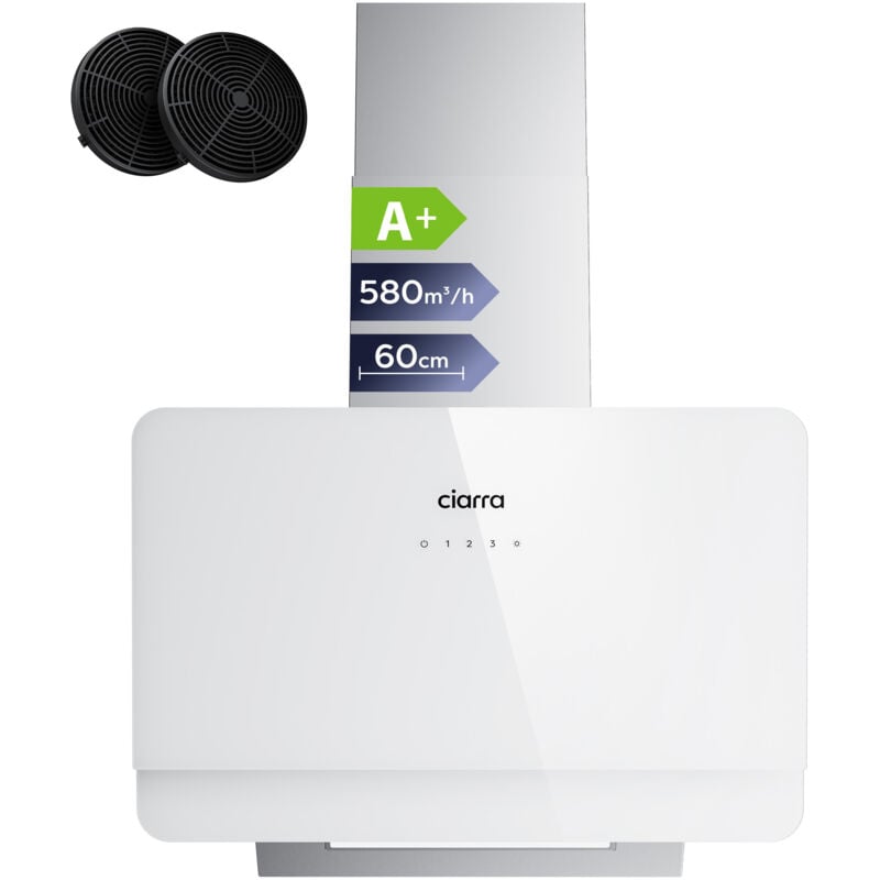 CIARRA CBCW6736N Hotte Aspirante Inclinée 60cm 750 m³/h - Hotte Tactile Class A - Filtre à Charbon Inclus - 3 Vitesses d’évacuation- Recyclage - LED Lampe - Blanc