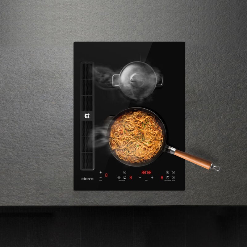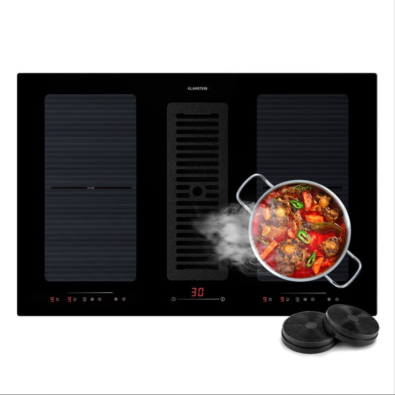 Plaque induction aspirante 83cm avec hotte intégrée 500m³h booster filtre à plasma noir aw834bbffbeh