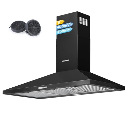 COMFEE Hotte aspirante 90 cm PYRA17B-90 noire pour hotte de cuisine avec LED, système de recirculation et canalisation et filtres à charbon