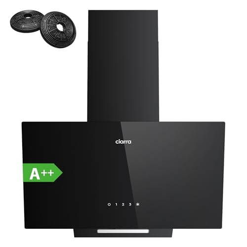 Ciarra CBCB6750C Classe A++ Hotte Murale Inclinée 60 cm 350 m³/h - 3 Vitesses - Mode Recyclage ou Evacuation - Filtre Charbon CBCF002 Inclus - Contrôle Tactile - Panneau en Verre Noir