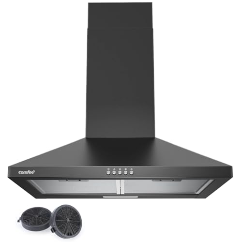 COMFEE' CHT 3.6A17B Hotte aspirante murale 60 cm avec flux d'air 320 m³/h, acier inoxydable, 5 couches, filtre à graisse lavable, filtre à charbon actif, 3 niveaux, cheminée réglable, 1 lumière LED noire