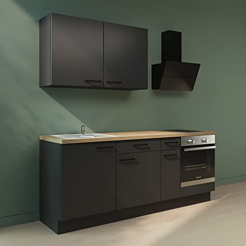 WALLERS Cuisine noire de 210 cm de long, four encastré, hotte, évier et mitigeur, plaque de cuisson 2 foyers (Plan de travail couleur chêne, Évier à gauche)