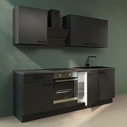 WALLERS Cuisine noire de 210 cm de long, lave-vaisselle intégré, four encastré, hotte, évier et mitigeur, plaque de cuisson 2 foyers (Plan de travail couleur béton, Évier à gauche)