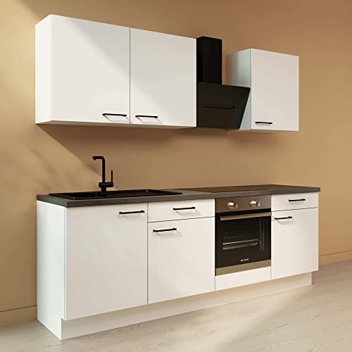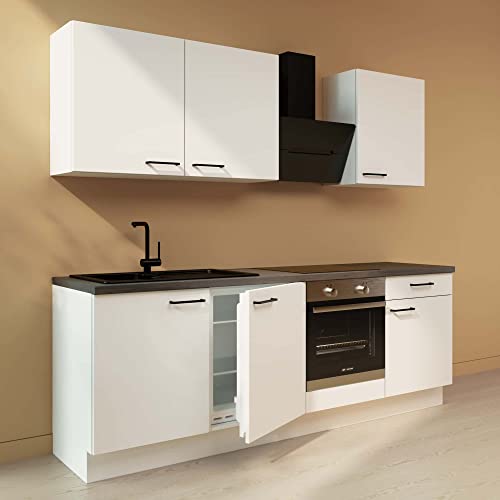 WALLERS Cuisine de 240 cm de long, four encastré, hotte, évier et mitigeur, plaque de cuisson de 4 foyers (Plan de travail couleur béton, Évier à gauche)
