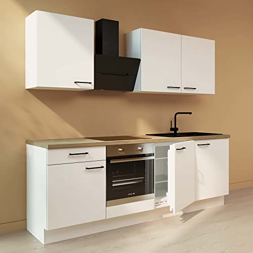 Wallers Cuisine de 210 cm de long, four encastré, hotte, évier et mitigeur, plaque de cuisson 2 foyers (Plan de travail couleur chêne, Évier à droite)