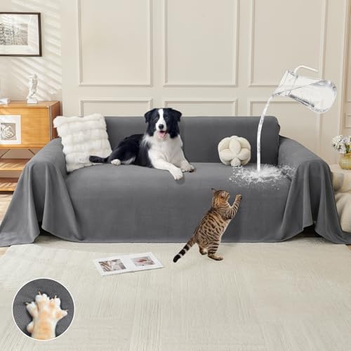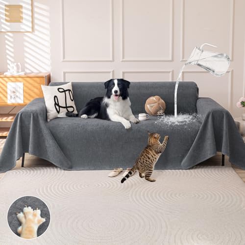 Royhom Protection Canape Chat Anti Griffe, Protege Canape Impermeable, Housse de Canapé 3 Place, Couvre Canapé d'angle, Sofa Cover Antidérapante, Gris, 340x180 cm