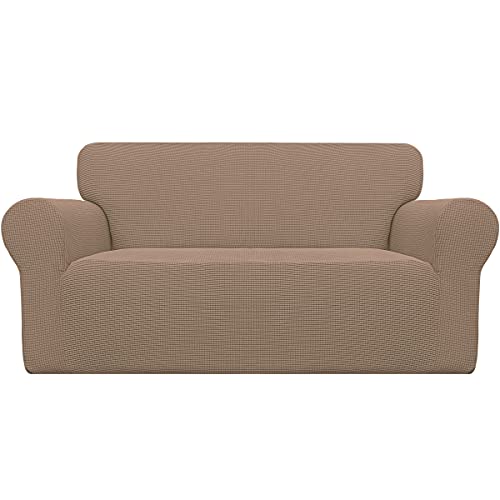 Easy-Going Housse de canapé Extensible 1 pièce pour canapé Doux avec élastique en Mousse antidérapante pour Enfants, Tissu Jacquard élasthanne, Petits Carreaux (Causeuse, Chameau)