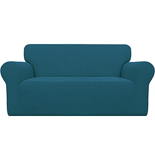 Easy-Going Housse de canapé Extensible 1 pièce pour canapé Doux avec élastique en Mousse antidérapante pour Enfants, Tissu Jacquard élasthanne, Petits Carreaux (Causeuse, Bleu Paon)