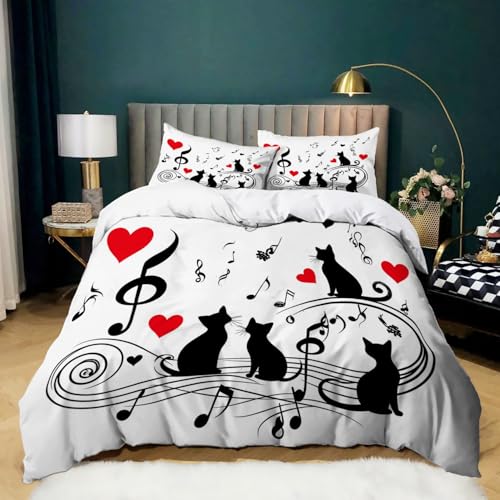 Housse de Couette 180x200 cm Chat Aimant Les Notes Musique, Parure de Lit Imprimée Éléments Musicaux pour 2 Personnes, Housses de Couette Microfibre Douce et Respirante avec 2 Taie d'oreiller