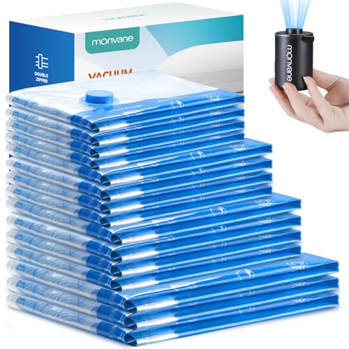 MONVANE Pompe Sans Fil et Sac Sous Vide Vêtement Aspirateur 15 Pieces - 3L 80x60cm 4M 70x50cm 4S 60x40cm 4XS 50x30cm, Housse de Rangement pour Voyage Valise Couette