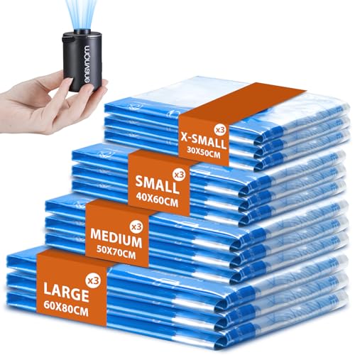 MONVANE Pompe Sans Fil et Sac Sous Vide Vêtement Aspirateur 12 Pieces - 3L 80x60cm 3M 70x50cm 3S 60x40cm 3XS 50x30cm, Housse de Rangement pour Voyage Valise Couette