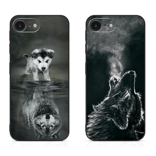 DiaryTown 2 Pièces Coque pour iPhone 16e Étui Noir Silicone Souple Case Cover avec Animal Motif Mince TPU Bumper Antichoc Protection Housse pour iPhone 16e 2025 - Chien & Loup